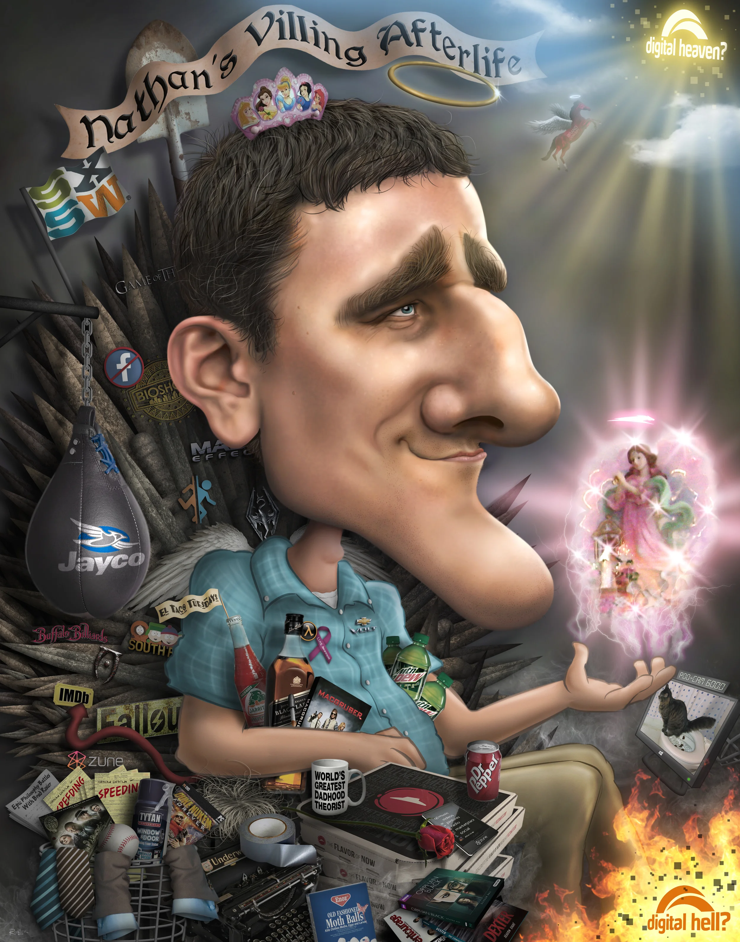 We offer professional, studio quality digital illustrations too. These are high-end, digital paintings that take a lot of time (and love) to create, but the end product captures the likeness of a friend, boss, colleague, celebrity, grandparent, spouse, graduate, you name it! The end result will look like an illustration you might see in a publication. Generally, we need very high quality, high resolution reference photographs to work from. Snapshots by Uncle Ned won't cut it. Contact us for a customized quote and more information on how the process works.